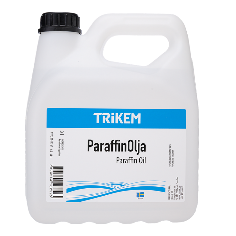 TRIKEM tillverkar paraffinoljan med mycket hög renhetsgrad. Den är fri från smak, lukt och färgämnen, och varje batch genomgår kvalitetskontroll för att uppfylla både svenska och europeiska standarder.