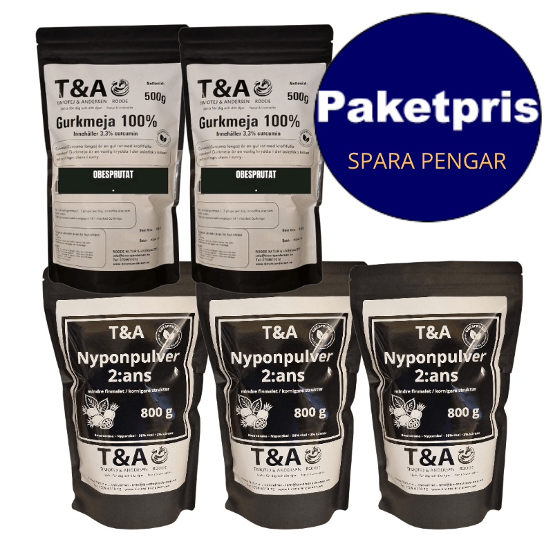 - Paketpriset inkluderar 3 påsar à 800 gram Nyponpulver och 2 påsar á 500g malen gurkmeja från T&A.