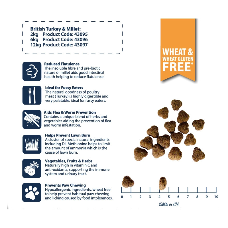Allergivänligt och Vetefritt Speciellt utvecklat för att minska risken för allergiska reaktioner, är Healthy Paws Dog Adult British Turkey & Millet fritt från vete och andra allergiframkallande ingredienser. Detta gör fodret idealiskt för hundar med känsliga magar eller matintoleranser.