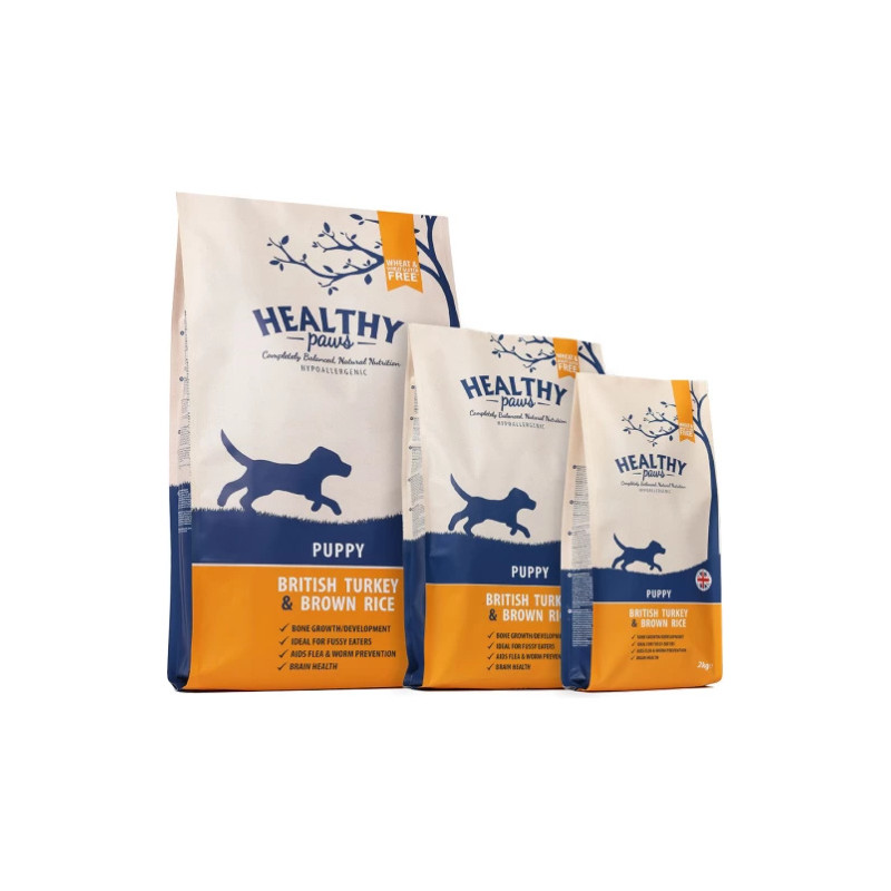 Healthy Paws Puppy British Turkey & Brown Rice är ett lättsmält och smakrikt torrfoder baserat på fjäderfäkött och avsett för valpar. Storleken på foderbitarna har anpassats efter valpen och krispigheten i bitarna hjälper till att hålla tänder och tandkött friskt. En kombination av kalcium och fosfor främjar och underhåller sunda höfter och leder hos valpar som växer. Fodret är naturligt rikt på Vitamin C och antioxidanter som främjar valpens immunsystem och urinvägar samt DHA som hjälper utvecklingen av hjärna och ögonfunktion. Den unika blandningen av örter och grönsaker minskar risk för lopp- och maskangrepp.