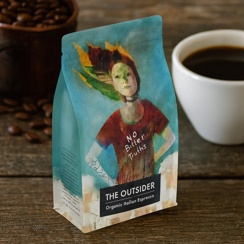 Summering: The Outsider är en ekologisk italiensk espresso med fyllig kropp, krämig textur och en mjuk bittersöt chokladton från robusta. Nyrostat, smakstabilt och tillgängligt både online och i butiken T&A Rödde Natur & Livskvalitet i Skurup.