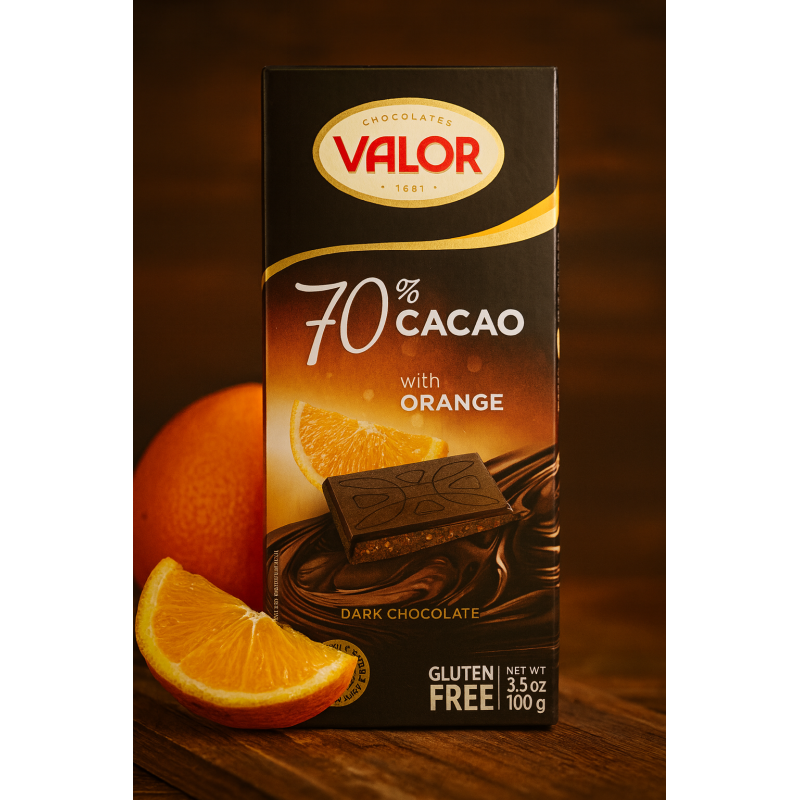 Valor 70% Mörk Choklad med Apelsin är en fyllig mörk choklad med 70 % kakao, fruktiga apelsinbitar och lång eftersmak. Glutenfri premiumchoklad för dig som vill ha tydlig kakaosmak med frisk apelsinton.