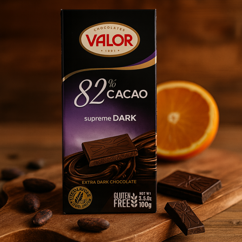 Valor är ett spanskt chokladhus med anor från 1881. Företaget har byggt sitt rykte på hög kakaokvalitet, egen kontroll över tillverkningen och en tydlig inriktning på premiumchoklad. Valors sortiment omfattar allt från klassisk mörk choklad till sockerfria alternativ och smaksatta varianter – men 82%-chokladen är en av de mest intensiva produkterna i serien.