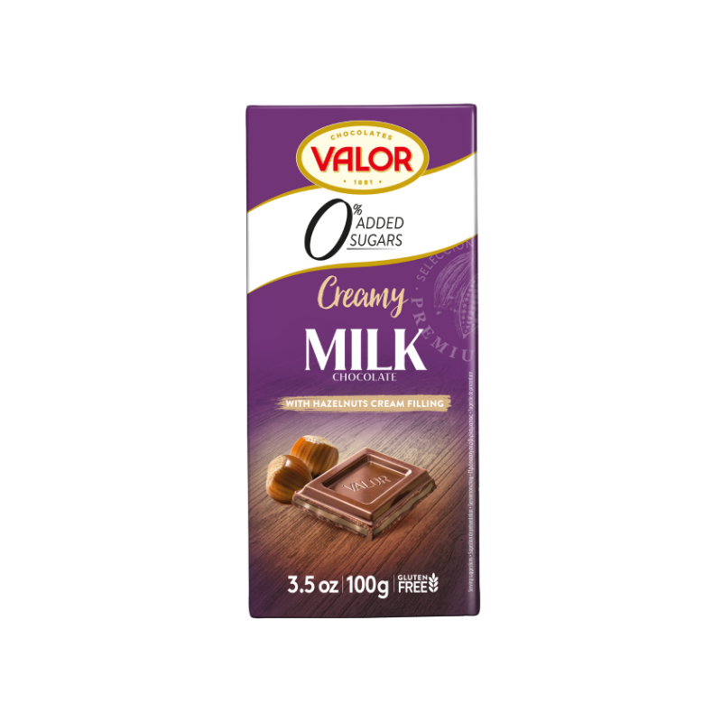 Valor mjölkchoklad med hasselnötsfyllning utan tillsatt socker är en fyllig och krämig chokladkaka för dig som vill njuta av hasselnötschoklad, men samtidigt undvika tillsatt socker. Den kombinerar len mjölkchoklad med en generös hasselnötsmousse-fyllning som ger en mjuk, nötig och rund smak med tydlig chokladkaraktär.