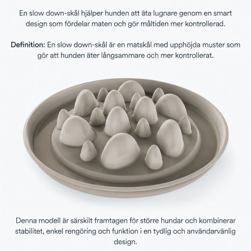 Många hundar äter snabbt, särskilt om de är ivriga vid matning. En slow down-skål används ofta av hundägare som vill göra måltiden lugnare, tydligare och mer balanserad.