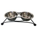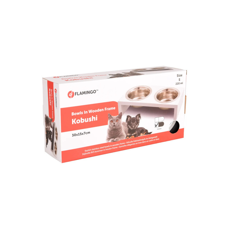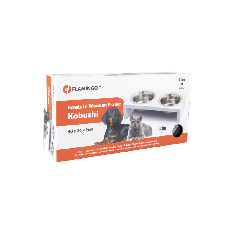 - Levereras med två rostfria skålar för mat och vatten samtidigt