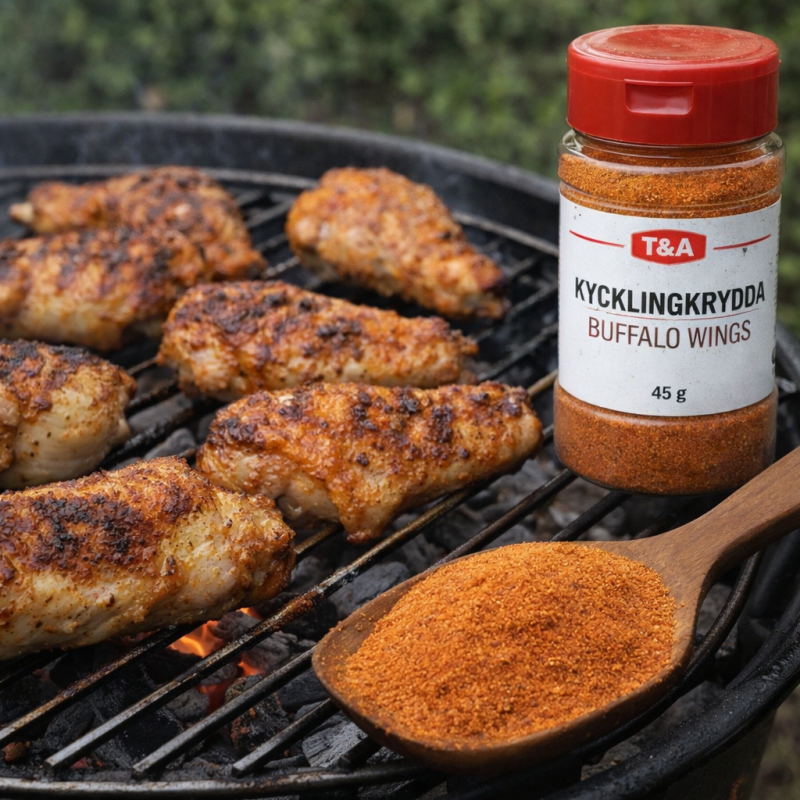Kycklingkrydda Buffalo Wings från T&A är en balanserad och smakrik kryddblandning med paprika, chili, vitlök och rosmarin. Används ofta vid torrmarinering eller mot slutet av grillning och stekning för extra karaktär och djup smak.
