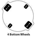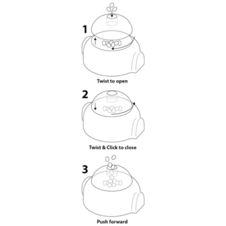 Leksaken har hjul på undersidan som gör att när hunden putttar leksaken frammåt så skjuts godiset eller fodret upp genom hålet i den transparantakupolen.