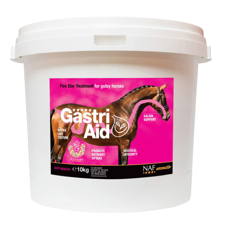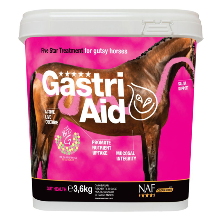 NAF GastriAid är ett avancerat fodertillskott som ger optimalt stöd för hela mag-tarmkanalen genom att balansera pH, stödja slemhinnan och främja en hälsosam tarmflora. Den unika sammansättningen av naturliga ämnen minskar belastningen på magen, stödjer tarmrörelser och förbättrar matsmältningen hos hästar som är känsliga för magproblem.