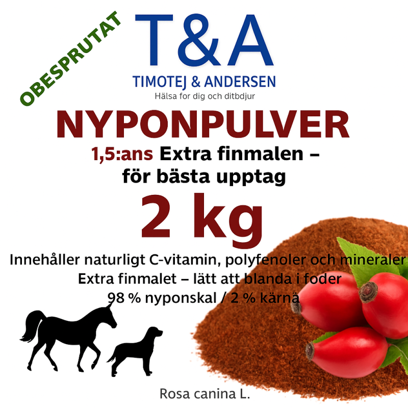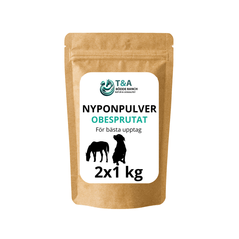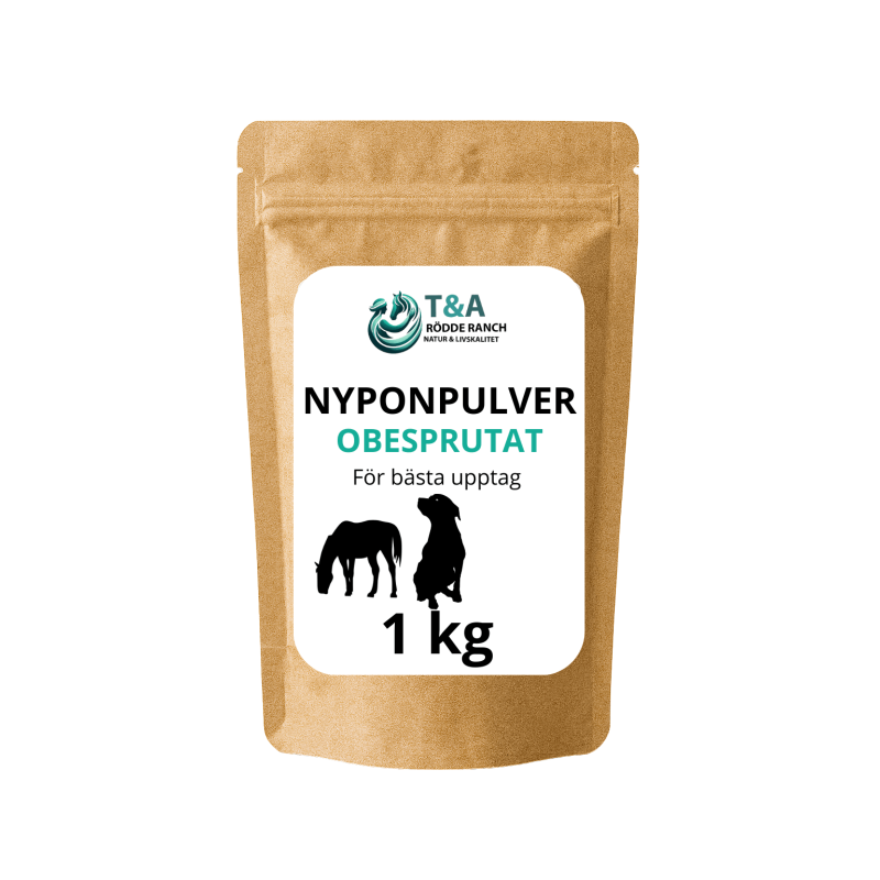 Nyponpulver (Rosa canina) framställs genom att nypon torkas varsamt och mals till ett fint pulver. Vår produkt är fin i strukturen, lätt att blanda i fodret och uppskattas av såväl hundar och hästar som katter. Nypon är traditionellt använda som livsmedel och tillskott på grund av sitt naturliga innehåll av C-vitamin, antioxidanter och bioaktiva växtämnen.