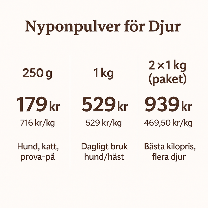 | 2 × 1 kg (paket) | 939 kr | 469,50 kr/kg | Bästa kilopris, flera djur |