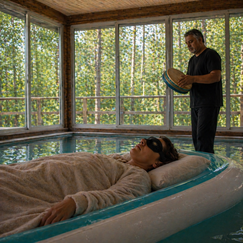 Du ligger torrt och bekvämt på en madrass och flyter i en inomhuspool medan kroppen gungar mjukt i vattnet. Vi börjar med en lugn meditation och går sedan över till oceandrum – ett instrument som låter som havets vågor.