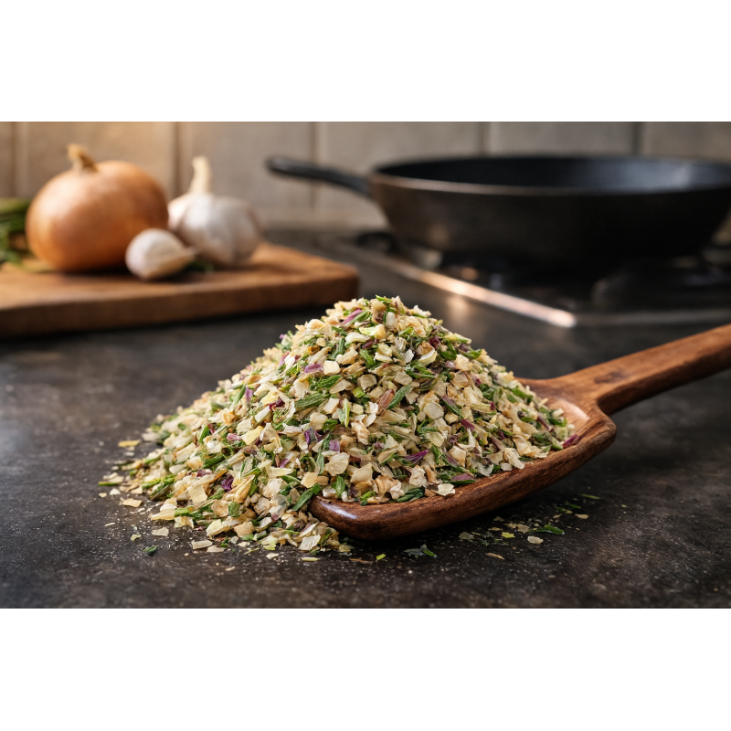 En saltsfri och smakrik lökkrydda med fem sorters lök. Perfekt till köttfärssås, grytor, såser och vardagsmat. En av våra mest använda och uppskattade kryddor.10