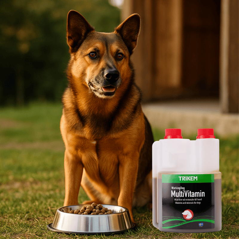 WorkingDog MultiVitamin – Trikem är ett flytande tillskott av vitaminer, mikromineraler och spårämnen som stödjer hundens kroppsfunktioner, energiomsättning och välmående. Det används som ett dagligt komplement till torrfoder, färskfoder eller hemlagad mat, och säkerställer att hunden får i sig alla nödvändiga mikronäringsämnen.