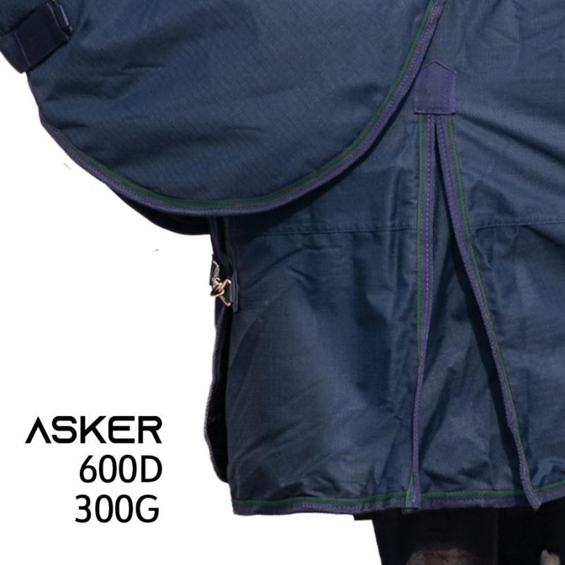 ASKER PLUS har kryssgjordar, svansrem och möjlighet till bensnören, vilket gör det lätt att anpassa passformen. Djupa bogveck bidrar samtidigt till rörelsefrihet, så att täcket kan ligga bra även när hästen rör sig mycket.